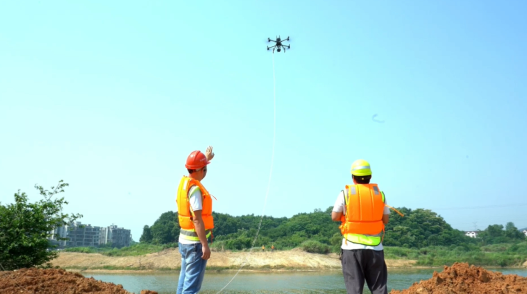 由于持续强降雨导致赤龙湖周边区域通信基站损毁,通信中断。移动通信抢险分队快速反应,利用新型无人机牵引布缆技术,同时运用轻便一体式卫星基站快速恢复通信。